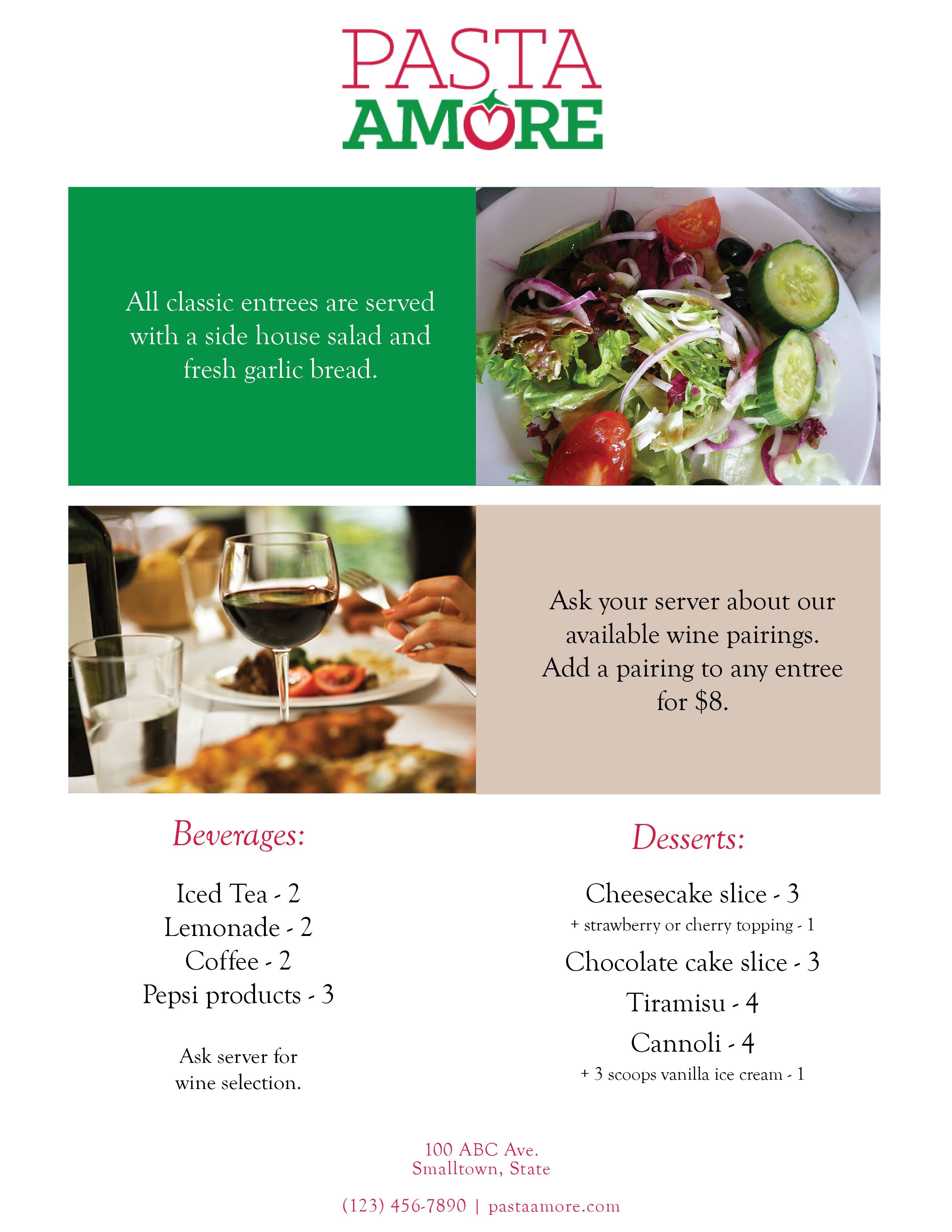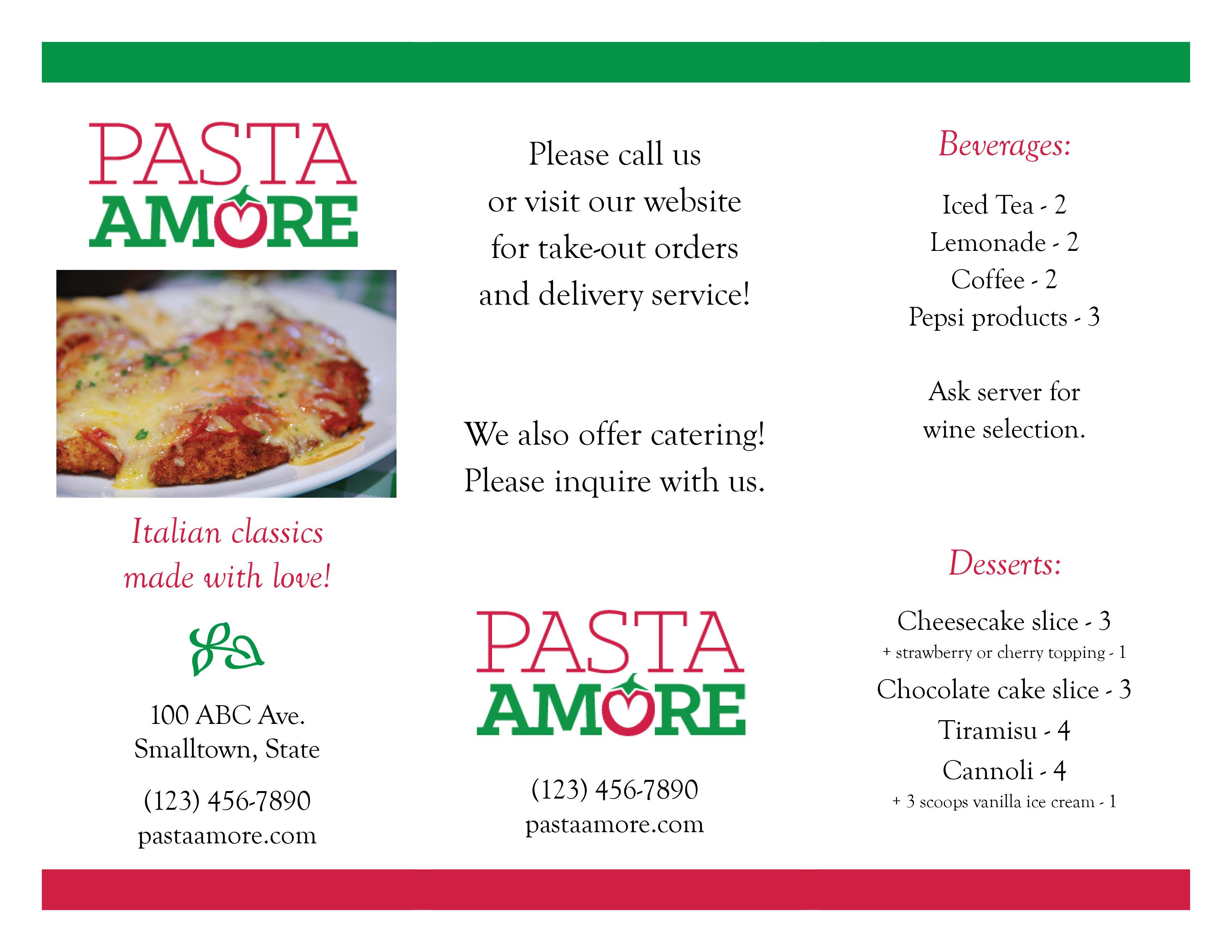 Tri-fold restaurant brochure created for COM-232 at SNHU.